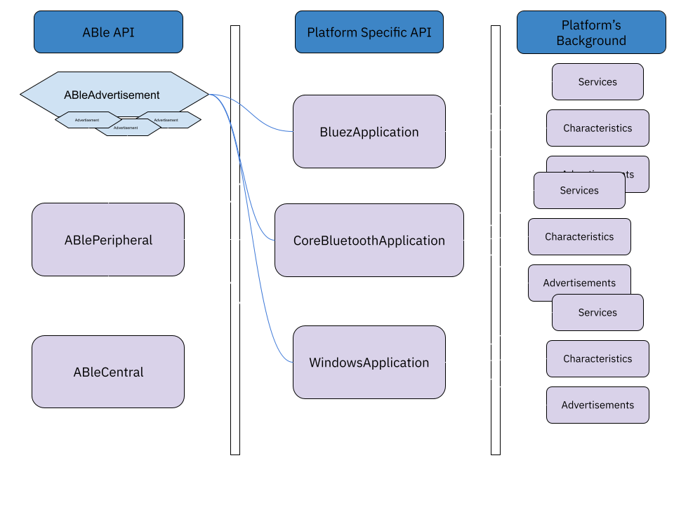 See below image for a visual for the abstraction that is core to how ABle works. The three main classes expose ABle’s Core API to developers which is platform agnostic. These classes utilize platform specific API’s with their own implementations such that the core API behaves the same on all supported platforms.